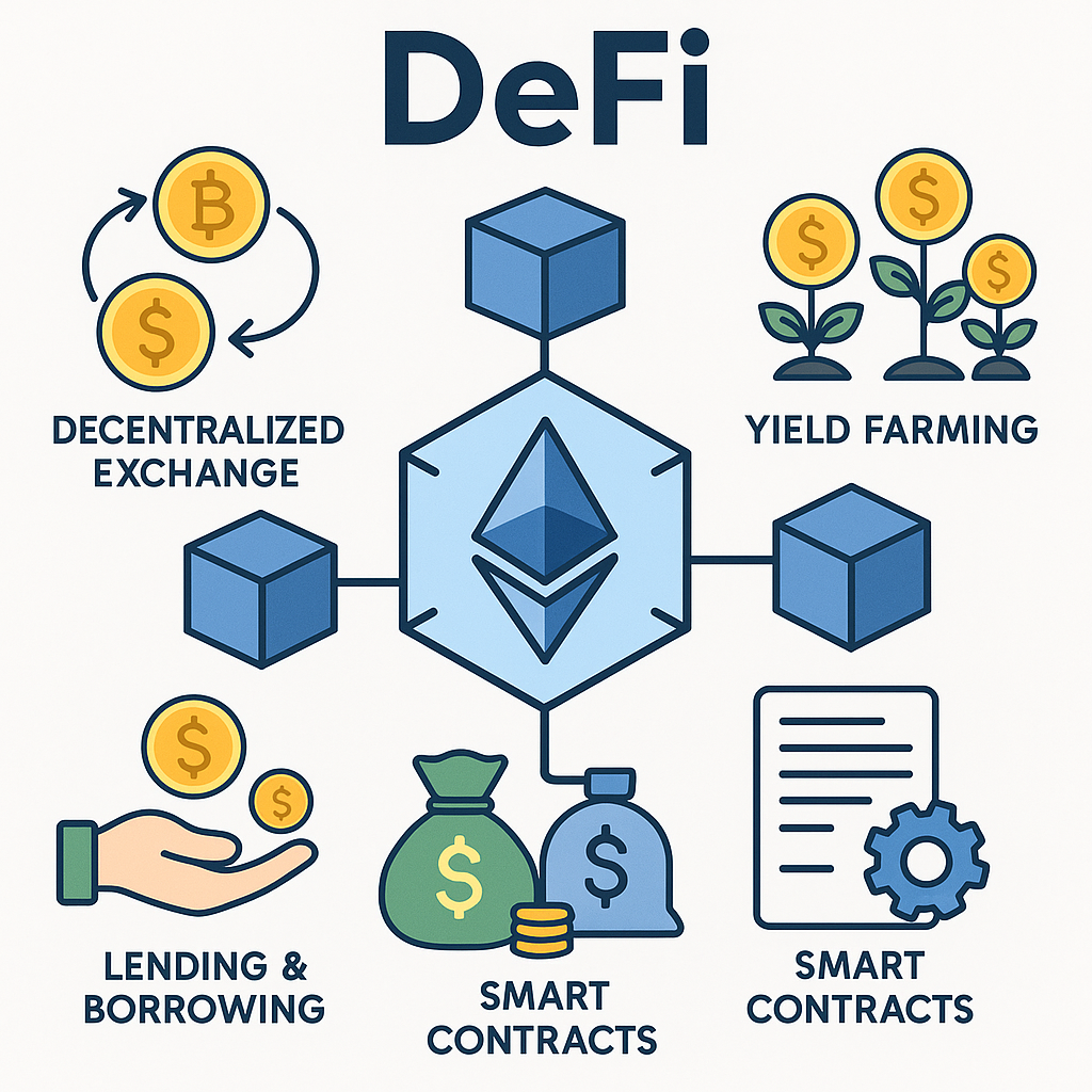 가장 기본적인 서비스는 암호화폐를 서로 바꾸는 거래소입니다. 예를 들어, 내가 가지고 있는 이더리움을 다른 암호화폐로 바꾸고 싶을 때, 일반 거래소(업비트나 바이낸스 등)에서는 중간에 회사가 있어요. 하지만 디파이에서는 "탈중앙화 거래소(DEX)" 를 이용해 직접 다른 사람과 교환할 수 있어요. 대표적인 DEX로는 Uniswap, SushiSwap 같은 곳이 있습니다. 여기서는 사람 대신 '자동화된 시장 메커니즘(AMM)' 이 가격을 정하고 거래를 처리해줍니다.